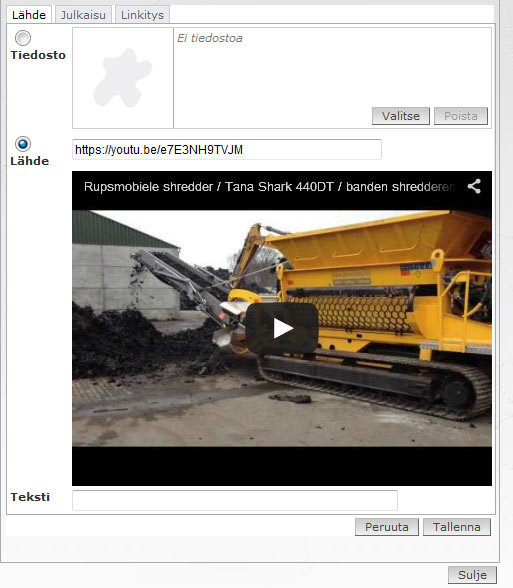 Valitaan Lähde-valinta ja tuodaan kenttään halutun Youtube-videon jaa-osoite kenttään.