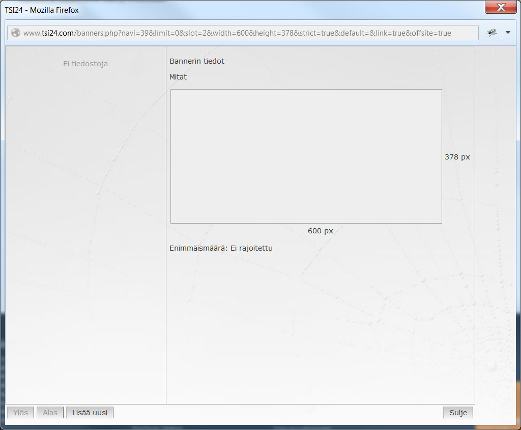 Bannerihallinnan aloitusikkunassa voidaan nähdä vasemalla jo hallintaan aikaisemmin kytketyt bannerikuvat. Oikealla voidaan nähdä määritteet, minkälaisia kuvia bannerihallintaan voidaan tuoda. Mitat kertovat onko korkeudelle ja leveydelle annettu tarkkoja tai minimi-/maksimilukuja piksin tarkkuudella. Enimmäismäärä kertoo, onko bannerikuvien määrää rajoitettu.